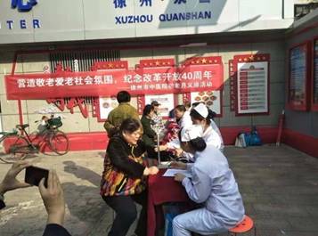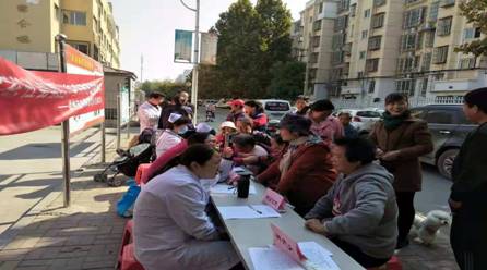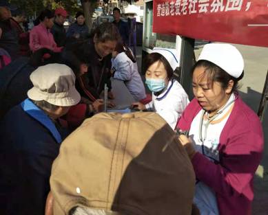 在小区活动中心,医护人员为居民们进行测量血压、血糖、健康咨询活动。义诊现场,医护人员为前来咨询的每一位老人进行心肺听诊、测血糖、测血压等检查,认真解答老年人在常见病、多发病的预防、治疗、康复、保健等方面上的疑问,在为一百多位老人义诊的同时,还发放了300余份健康宣传手册。