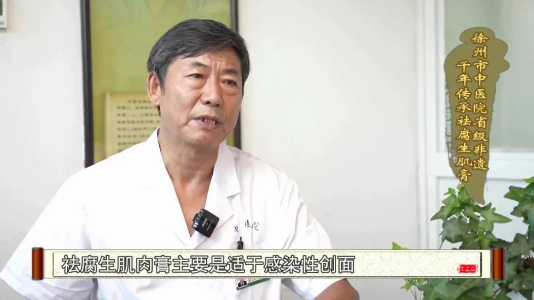 杨六中主任介绍,祛腐生肌膏适用于感染性创面、化脓性创面,主要功效是祛腐,腐就是指感染。把腐肉去掉以后,促进炎症消退,加速肉芽组织生成,加速上皮细胞生成,使皮肤逐渐在炎症消退过程中,表皮逐渐生成