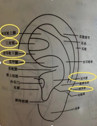 耳穴在耳郭的分布有一定的规律。我们的耳郭形如胚胎,一个倒置的胎儿。