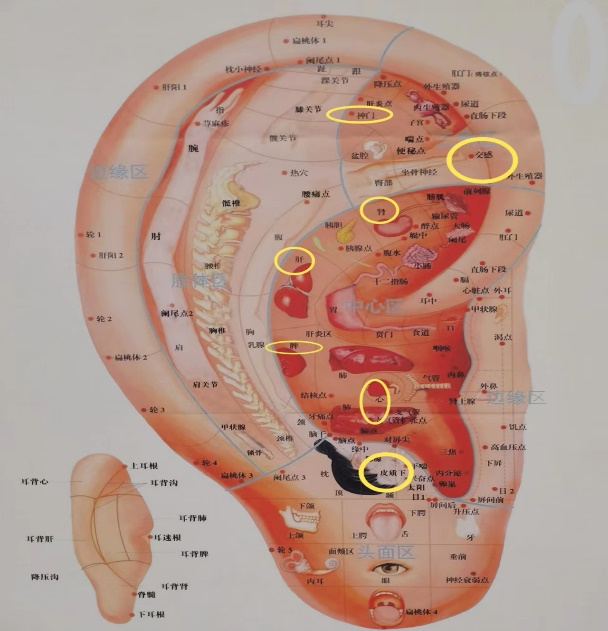 失眠,中医上根据临床辨证分型,多与我们人体的心、肝、肾、脾等脏腑功能失调有密切关系,所以我们可以在耳穴上找以上对应的脏器心、肝、肾、脾。配以耳穴中主治失眠的神门穴、皮质下,主治自主神经功能紊乱的交感穴来治疗改善失眠。