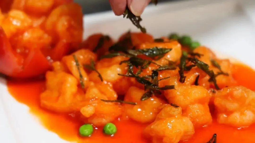 内经曰:“肝苦急,急食甘以缓之”茄汁龙井虾仁是我们第一个甜味菜,它是三菜合一的创新菜,也为应清明节气之景。