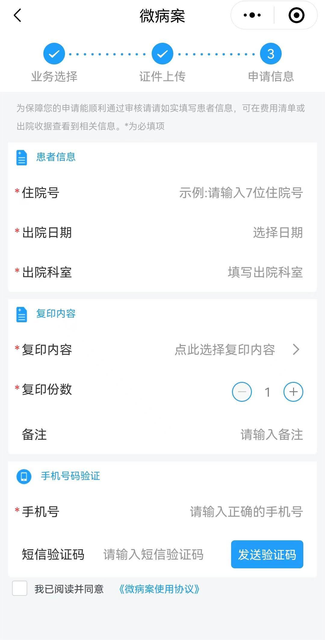 1.点击【申请复印】填写申请内容和住院信息,上传照片