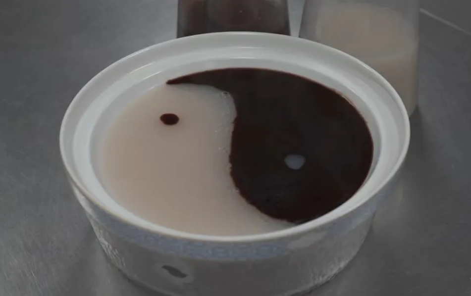 中医讲究阴阳平衡,天人合一。第二道药膳莲藕太极粥延续中医传统思想。通过黑粥食材薏米、桑葚、粳米、莲子等与白粥食材梨、莲藕、大米等食材相互搭配。桑葚滋阴补血,熟莲藕健脾开胃、益血生肌。阴阳协调总体上起到滋养脾胃、益肾固精、滋阴润燥、养心安神等作用。