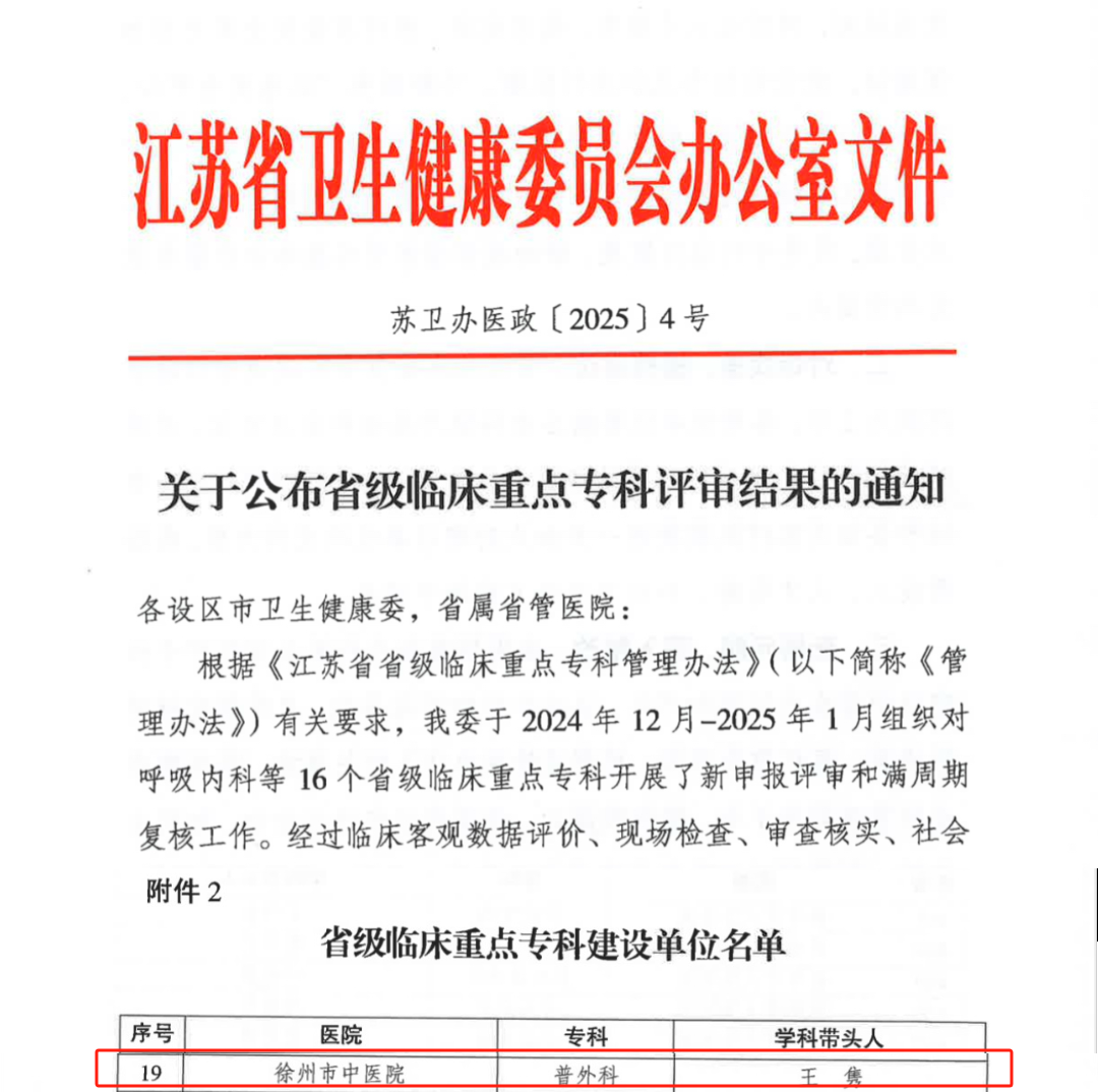此次,我院普外科获批江苏省临床重点专科建设单位,用实力彰显了医院在普外科领域的专业水平。未来,医院将以此为契机,持续加大对重点专科建设的投入,加强人才培养和科研创新,不断提升医疗服务质量,为徐淮经济区百姓健康做出更大的贡献!