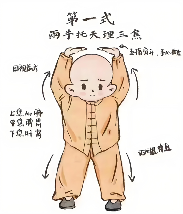 注:此式以调理三焦为主。三焦分为上、中、下三焦,其中上焦包括心肺,中焦包括脾胃,下焦包括肝肾。此式可以充分伸展肢体,对三焦包括心肺、脾胃、肝肾相关疾病都有很好的调理作用,可以治疗胸闷咳嗽,胃肠道紊乱,腰膝酸软,腰背痛,易疲劳等。