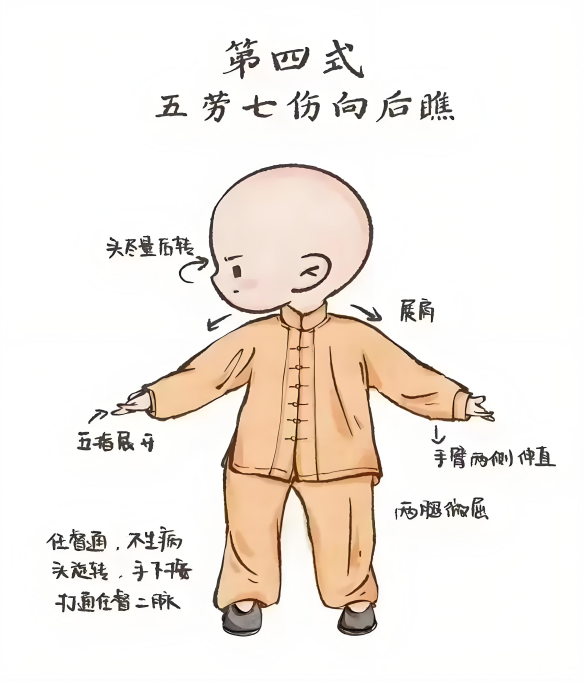 注:五劳是指因劳逸不当,活动失调而引起心、肝、脾、肺、肾五脏受损。七伤指喜、怒、思、忧、悲、恐、惊等异常情绪对脏腑机能的伤害。该式动作实际上是一项全身性的运动,尤其是腰、头颈、眼球等的运动。此式对防治颈椎病、高血压、眼病和增强眼肌有良好的效果。