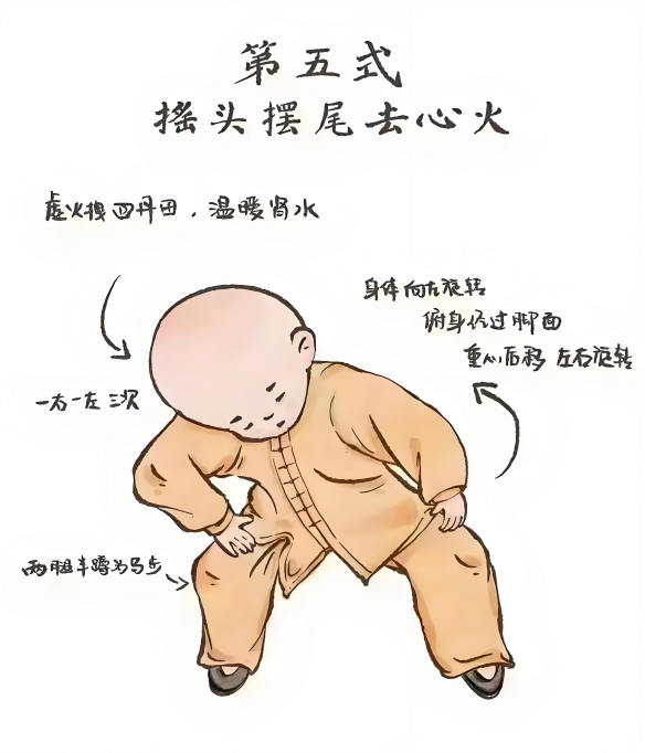 注:此式动作除强调松,以解除紧张并使头脑清醒外,还必须强调静。俗谓:静以制躁。动作要保持逍遥自在,并延长呼气时间,消除交感神经的兴奋,以去“心火”。同时对腰颈关节、韧带和肌肉等亦起到一定的作用,并有助于任、督、冲三脉的运行。