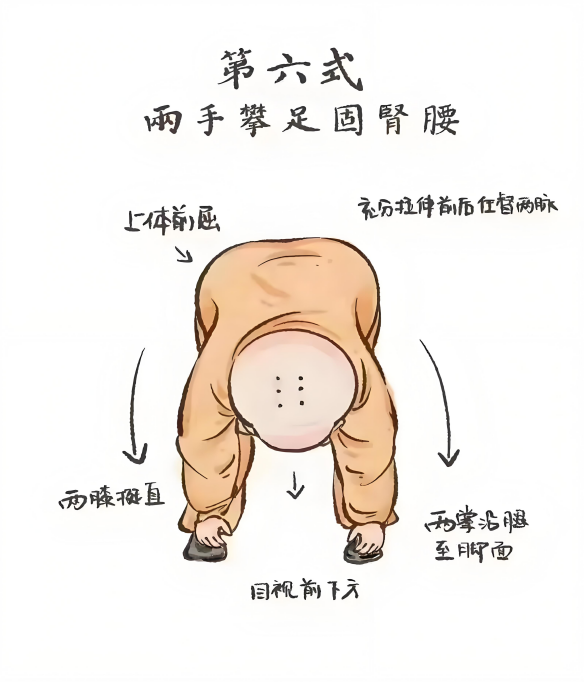 注:此式主要运动腰部肌肉及相关脏器,腰为肾之腑,长期坚持锻炼,有疏通带脉及任督二脉的作用,能强腰、壮肾、醒脑、明目,并使腰腹肌得到锻炼和加强。年老体弱者,俯身动作应逐渐加大,有较重的高血压和动脉硬化患者,俯身时头不宜过低。