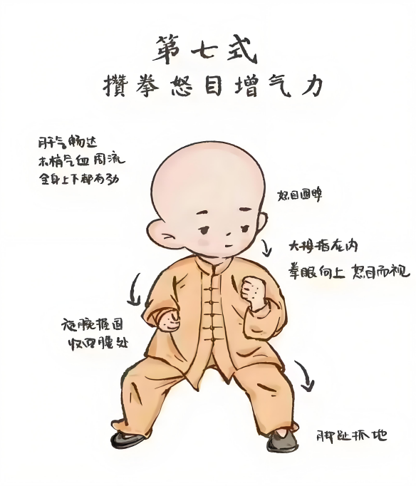 注:此式动作要求两拳握紧,两脚拇趾用力抓地,舒胸直颈,聚精会神,瞪眼怒目。此式主要运动四肢、腰和眼肌。其作用是舒畅全身气机,增强肺气,并有增强全身筋骨和肌肉的作用。