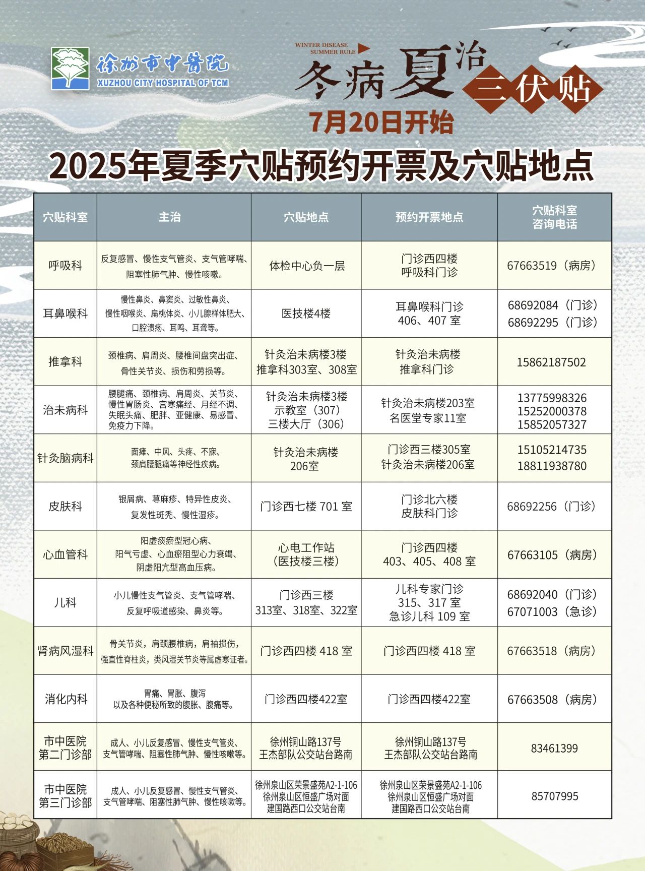 温馨提示 如果您错过了以上的集中贴敷时间,也可以到相应科室进行贴敷。凡7月20日前(不含当日)提前预约、开单者,凭穴贴缴费收据到一楼大厅服务台领取扇子一把(数量有限先到先得,送完为止)。