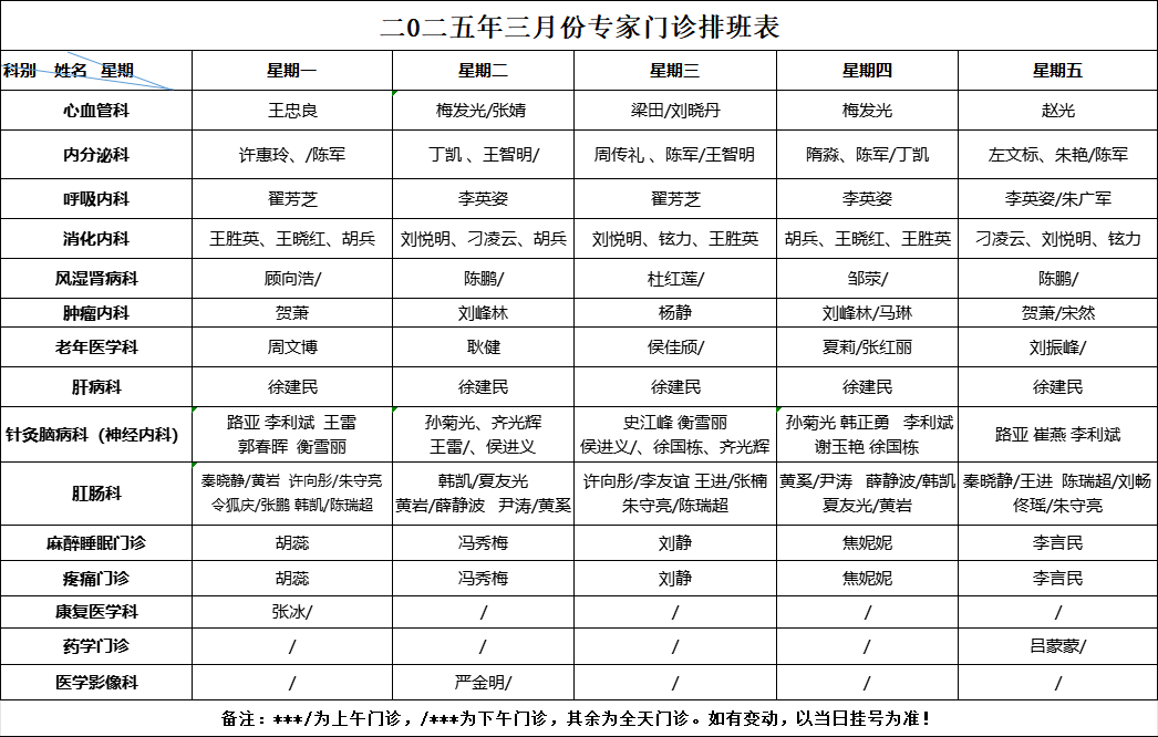为了方便您就医请您来院前提前预约挂号按照预约时间段提前半小时到达就诊区凭电子挂号单刷码报到现将3月份门诊排班表分享给大家,建议收藏!2025年3月份专家门诊排班...