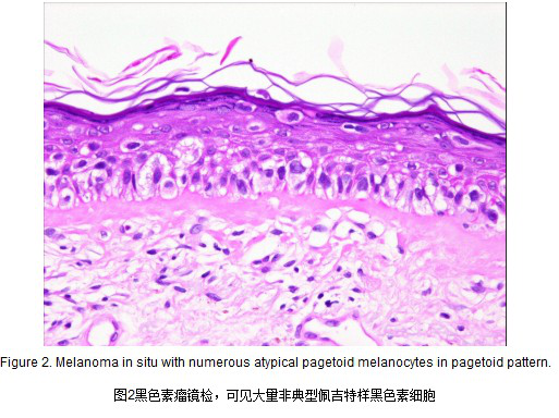 另一方面,黑色素瘤的非典型佩吉特样细胞跟乳房外佩吉特病的细胞相类似,通常含有大型核,以及大量浅色细胞质。黑色素瘤中可能存在许多大型嗜碱性圆形/椭圆形、梭形黑色素细胞,也可能存在多形态的大型细胞核、大型核仁,以及大量浅色细胞质构成的多边形态的佩吉特样黑色素细胞(图2)。
