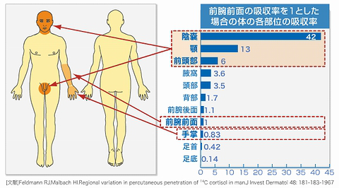 (4 )患病部位不同:不同部位糖皮质激素的吸收率不同。例如,前臂及后背的吸收系数较低为0.14,头皮的吸收系数为3.0,前额为6.0,面部的吸收系数在13.0,而阴囊吸收系数最高,为42.0。临床上应根据皮损部位的不同选择不同效能的药物。