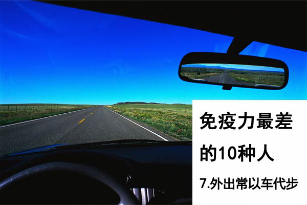 有车一族越来越多,大约25%的人已经丢掉了走路的习惯。研究发现,整天开车到处走的人比喜欢走路的人,生病的时间长2倍。专家称,每天进行30分钟的有氧运动(如快走),免疫系统的工作效率更高。