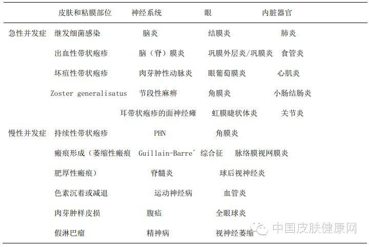 在急性期,皮肤受累的主要表现为继发细菌感染,可出现深脓疱样溃疡。其他主要皮肤并发症有出血(出血性带状疱疹)、化脓性坏疽(坏疽性带状疱疹)、皮损持续及播散至全身,产生广泛性水痘样皮疹(播散性带状疱疹),后者主要发生于免疫缺陷患者。皮肤慢性后遗症包括色素减退及色素脱失性瘢痕。罕见肉芽肿性反应及寻常型银屑病样表现。(Ko¨bner’s 现象) 。