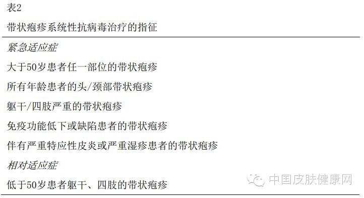 此外,如果皮疹发生超过一个皮区、有出血性皮损和(或)粘膜受累,也应接受系统性抗病毒治疗。(表2)