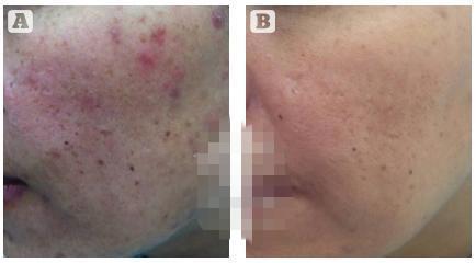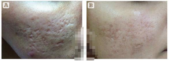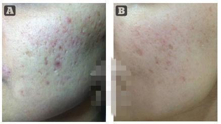 图1 3次治疗前(A)后(B)活跃痤疮和痤疮瘢痕情况