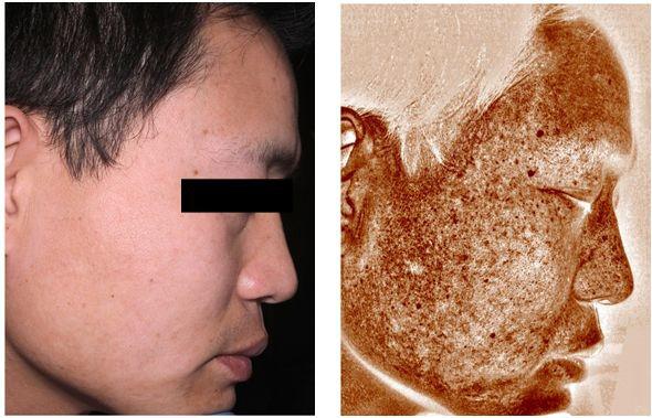 案例4:这位顾客的皮肤肉眼看是比较干净的,但通过皮肤检测仪的检测可以清晰的看到皮肤底层有黄褐斑的存在