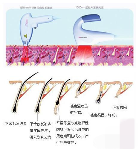 这种除毛的方法可穿透表皮,进入真皮内,选择性地被毛发和毛囊中的黑素颗粒吸收,产生光热效应,毛发内的热能可向周围传导,将毛囊和毛干彻底收缩,产生永久性除毛。而毛囊周边其他嘴直内不含黑素颗粒所以不吸收这种激光,不会产生伤害,更安全更彻底。