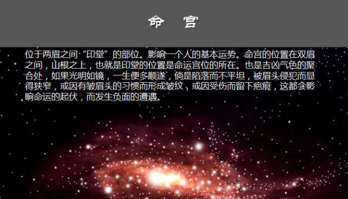 额头具体位置,是从前额发际到眼睛上方,它能透析出一个人祖上遗传、智力表现、财运、桃花运等。人的运势好坏,主要是由额部来推断。从十二宫位看,额部包括“命宫、官禄宫、福德宫、兄弟宫”。
