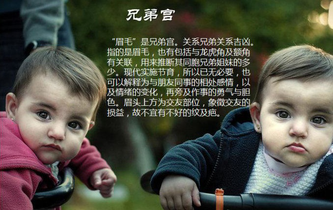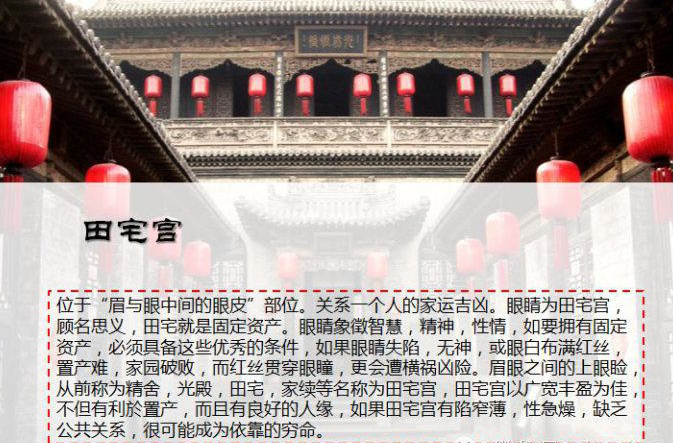 上眼睑:代表“田宅宫”,如果此处凹陷、或有痣、疤痕等缺陷,这样的人容易经常搬家,购买房地产须特别谨慎,以免出现纠纷或吃大亏。另外,随着年龄老化,会有眉毛下垂的现象,导致眉眼之间的距离太近,面相学认为眉压眼是不好的面相,不但外形看起来较忧郁,眉压眼也会压迫自己和兄弟姐妹的运势,通常不容易置不动产。