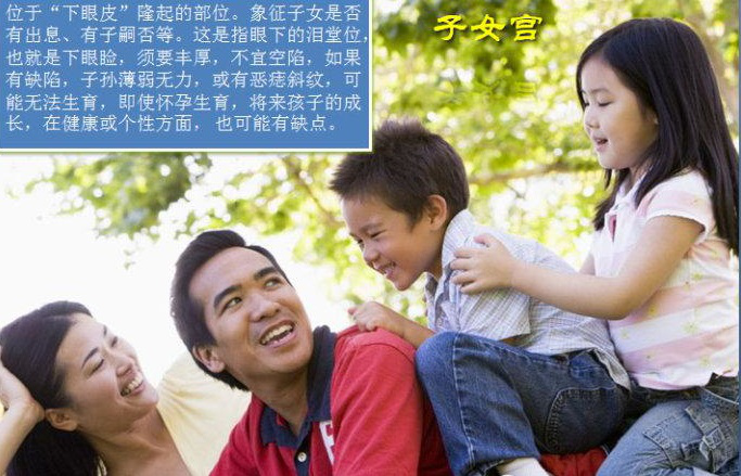 下眼睑:此处代表“子女宫”,如果下眼睑有明显的眼袋,或长痣或瘜肉都是不好的面相,命理上认为容易与子女无缘,可能会影响生殖力,或是有不孕问题,晚年运势较不顺利。