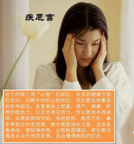 鼻部:包括鼻梁高低、鼻翼。鼻梁:两眉中间的山根(鼻跟部)代表“疾厄宫”,山根高表示事业有成、健康状况佳,山根塌陷的人较缺乏自信,容易被他人左右意见,不易担任主管职,鼻梁短小的人则自行创业比较困难,不能够独挡一面,相反鼻梁丰隆的人三十岁以后,财运见长,会“一路发”。民间常把山根高低与男性的性能力联想在一起,其实正是因疾厄宫主宰一个人的健康状态,山根高表示健康好,当然性能力相对也较优。